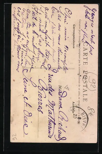 Personenbezogene Daten auf der Rückseite der Karte wurden durch blauen Textmarker unkenntlich gemacht. Die blauen Stellen sind auf die Vorderseite durchgeweicht und wirken sich negativ auf das Postkartenfoto aus