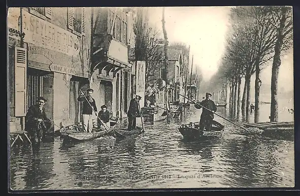 AK Asnières, Inondation de janvier 1910, Le quai d`Asnières avec barques