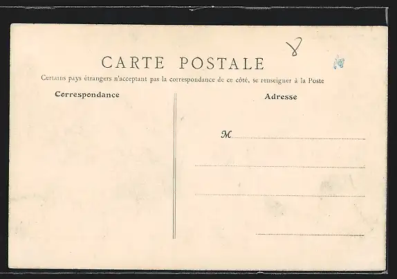 Personenbezogene Daten auf der Rückseite der Karte wurden durch blauen Textmarker unkenntlich gemacht. Die blauen Stellen sind auf die Vorderseite durchgeweicht und wirken sich negativ auf das Postkartenfoto aus