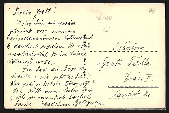 Personenbezogene Daten auf der Rückseite der Karte wurden durch blauen Textmarker unkenntlich gemacht. Die blauen Stellen sind auf die Vorderseite durchgeweicht und wirken sich negativ auf das Postkartenfoto aus