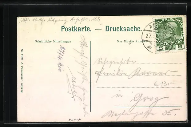 Personenbezogene Daten auf der Rückseite der Karte wurden durch blauen Textmarker unkenntlich gemacht. Die blauen Stellen sind auf die Vorderseite durchgeweicht und wirken sich negativ auf das Postkartenfoto aus