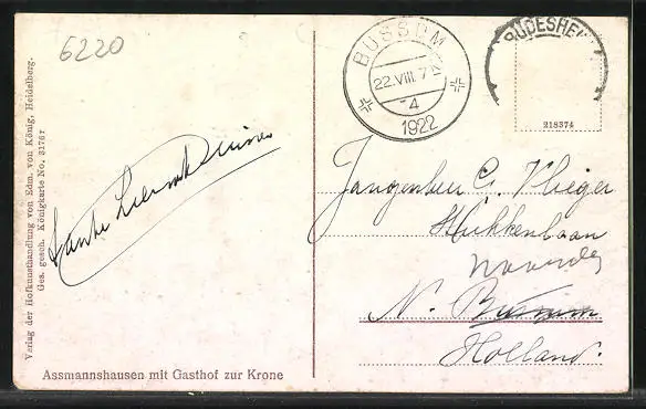 alte Ansichtskarte, gelaufen 1922, Briefmarke entfernt, Eckknick unten li., guter Zustand