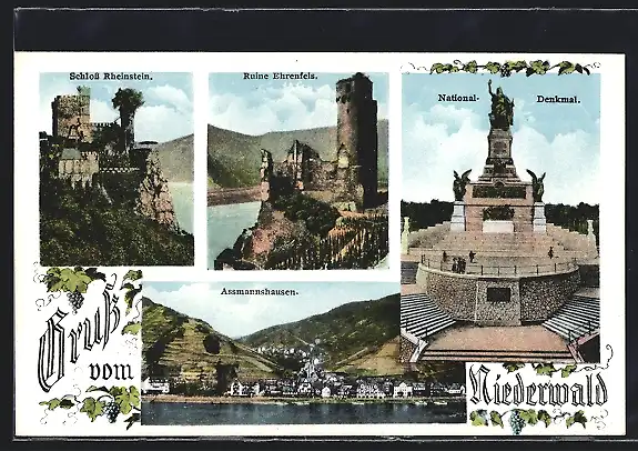 AK Assmannshausen, Schloss Rheinstein, Ruine Ehrenfels, National-Denkmal