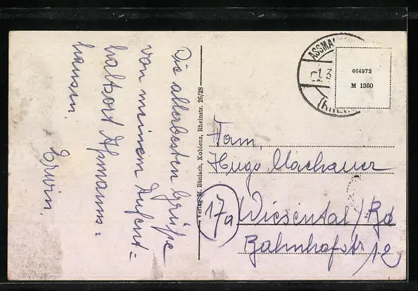 Personenbezogene Daten auf der Rückseite der Karte wurden durch blauen Textmarker unkenntlich gemacht. Die blauen Stellen sind auf die Vorderseite durchgeweicht und wirken sich negativ auf das Postkartenfoto aus
