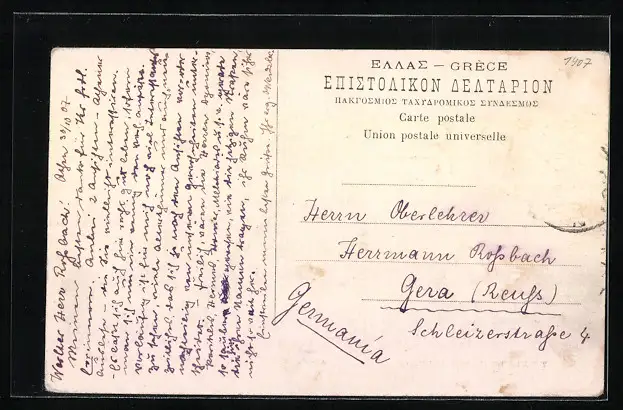 gelaufen 1907, Briefmarke entfernt, Eckknick oben rechts, guter Zustand