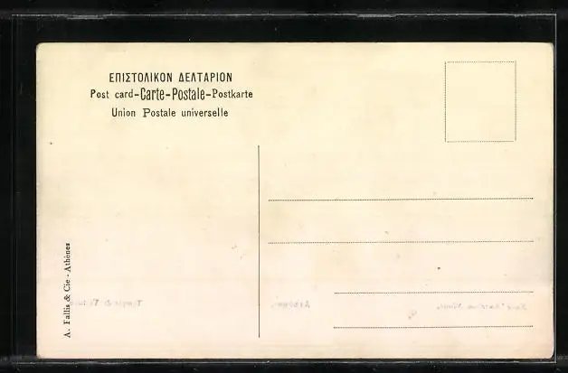 Personenbezogene Daten auf der Rückseite der Karte wurden durch blauen Textmarker unkenntlich gemacht. Die blauen Stellen sind auf die Vorderseite durchgeweicht und wirken sich negativ auf das Postkartenfoto aus