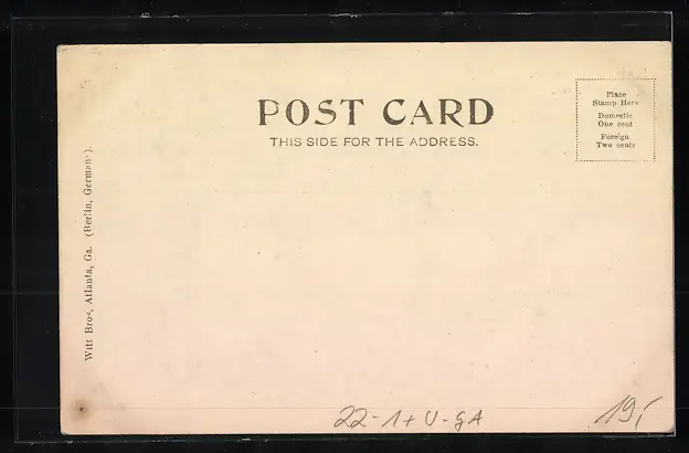 Personenbezogene Daten auf der Rückseite der Karte wurden durch blauen Textmarker unkenntlich gemacht. Die blauen Stellen sind auf die Vorderseite durchgeweicht und wirken sich negativ auf das Postkartenfoto aus