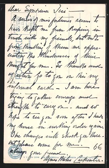 Personenbezogene Daten auf der Rückseite der Karte wurden durch blauen Textmarker unkenntlich gemacht. Die blauen Stellen sind auf die Vorderseite durchgeweicht und wirken sich negativ auf das Postkartenfoto aus