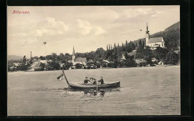 AK Attersee, Ruderer auf dem See, Ortsansicht mit Kirche
