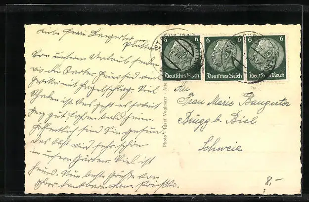 Personenbezogene Daten auf der Rückseite der Karte wurden durch blauen Textmarker unkenntlich gemacht. Die blauen Stellen sind auf die Vorderseite durchgeweicht und wirken sich negativ auf das Postkartenfoto aus