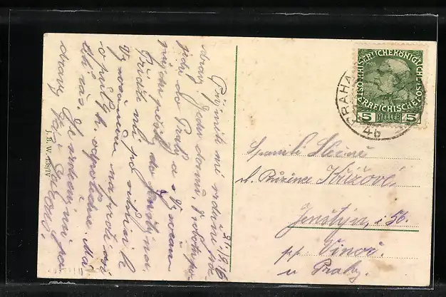 Personenbezogene Daten auf der Rückseite der Karte wurden durch blauen Textmarker unkenntlich gemacht. Die blauen Stellen sind auf die Vorderseite durchgeweicht und wirken sich negativ auf das Postkartenfoto aus