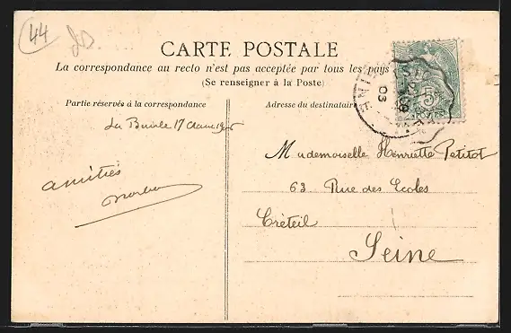 Personenbezogene Daten auf der Rückseite der Karte wurden durch blauen Textmarker unkenntlich gemacht. Die blauen Stellen sind auf die Vorderseite durchgeweicht und wirken sich negativ auf das Postkartenfoto aus