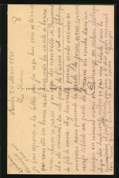 Personenbezogene Daten auf der Rückseite der Karte wurden durch blauen Textmarker unkenntlich gemacht. Die blauen Stellen sind auf die Vorderseite durchgeweicht und wirken sich negativ auf das Postkartenfoto aus