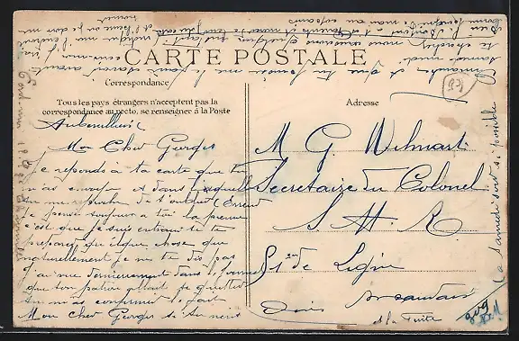 Personenbezogene Daten auf der Rückseite der Karte wurden durch blauen Textmarker unkenntlich gemacht. Die blauen Stellen sind auf die Vorderseite durchgeweicht und wirken sich negativ auf das Postkartenfoto aus