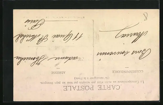Personenbezogene Daten auf der Rückseite der Karte wurden durch blauen Textmarker unkenntlich gemacht. Die blauen Stellen sind auf die Vorderseite durchgeweicht und wirken sich negativ auf das Postkartenfoto aus