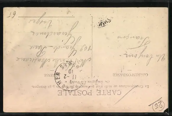 Personenbezogene Daten auf der Rückseite der Karte wurden durch blauen Textmarker unkenntlich gemacht. Die blauen Stellen sind auf die Vorderseite durchgeweicht und wirken sich negativ auf das Postkartenfoto aus