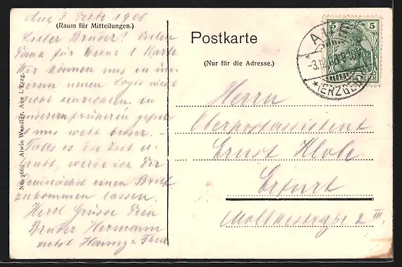 alte Ansichtskarte, gelaufen 1908, Eckknick li. unten, guter Zustand