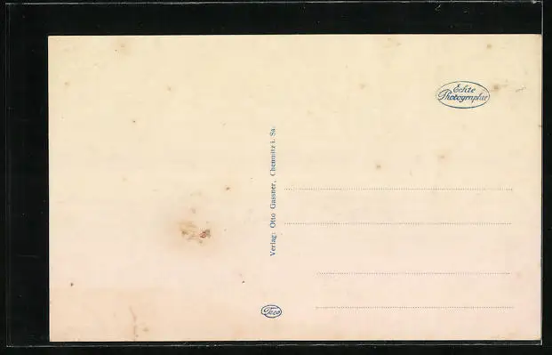 Personenbezogene Daten auf der Rückseite der Karte wurden durch blauen Textmarker unkenntlich gemacht. Die blauen Stellen sind auf die Vorderseite durchgeweicht und wirken sich negativ auf das Postkartenfoto aus