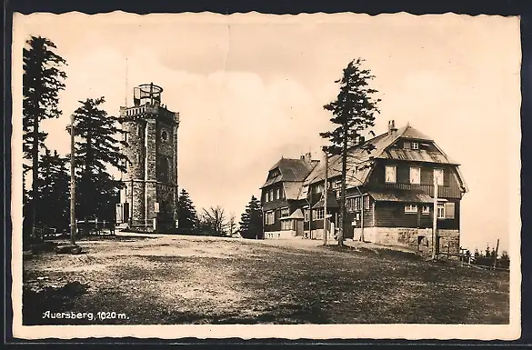 AK Auersberg, Ortspartie mit Aussichtsturm