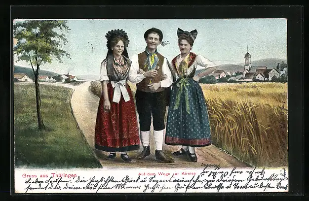 AK Auf dem Wege zur Kirmes, Thüringer in Tracht