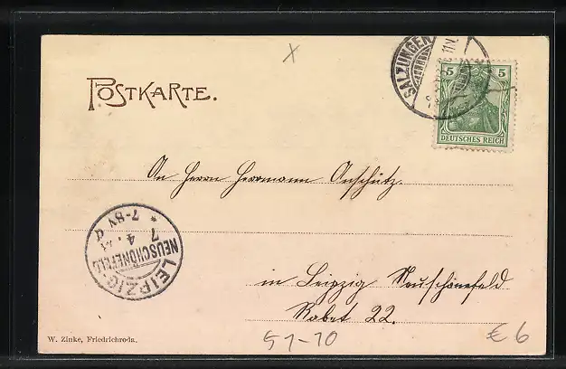 Personenbezogene Daten auf der Rückseite der Karte wurden durch blauen Textmarker unkenntlich gemacht. Die blauen Stellen sind auf die Vorderseite durchgeweicht und wirken sich negativ auf das Postkartenfoto aus