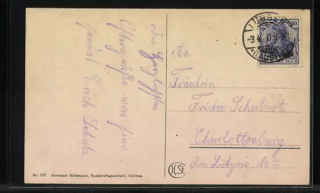 Personenbezogene Daten auf der Rückseite der Karte wurden durch blauen Textmarker unkenntlich gemacht. Die blauen Stellen sind auf die Vorderseite durchgeweicht und wirken sich negativ auf das Postkartenfoto aus