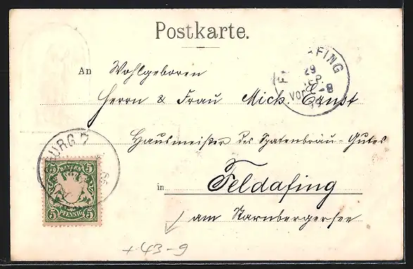 Personenbezogene Daten auf der Rückseite der Karte wurden durch blauen Textmarker unkenntlich gemacht. Die blauen Stellen sind auf die Vorderseite durchgeweicht und wirken sich negativ auf das Postkartenfoto aus