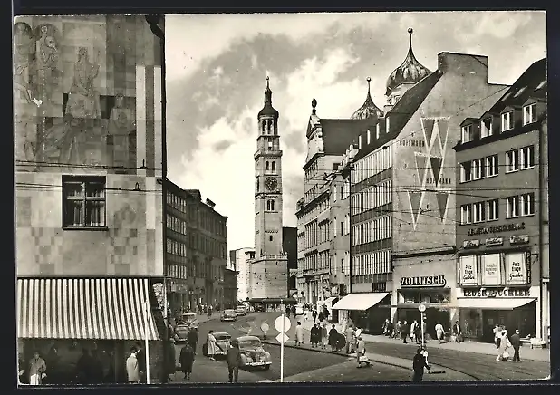 AK Augsburg, Maximilianstrasse mit Rathaus und Perlachturm