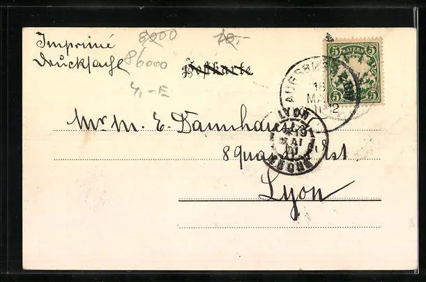 Personenbezogene Daten auf der Rückseite der Karte wurden durch blauen Textmarker unkenntlich gemacht. Die blauen Stellen sind auf die Vorderseite durchgeweicht und wirken sich negativ auf das Postkartenfoto aus