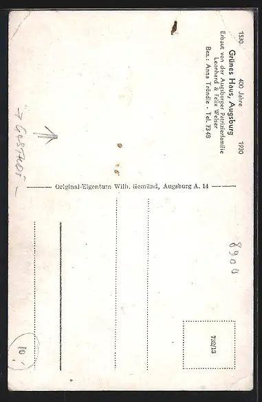 Personenbezogene Daten auf der Rückseite der Karte wurden durch blauen Textmarker unkenntlich gemacht. Die blauen Stellen sind auf die Vorderseite durchgeweicht und wirken sich negativ auf das Postkartenfoto aus