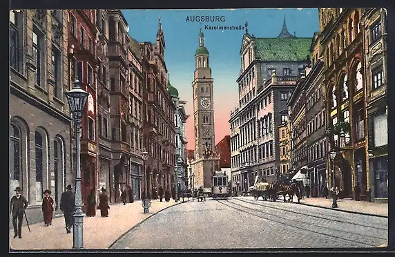 AK Augsburg, Strasse am Perlachturm und Rathaus, Strassenbahn