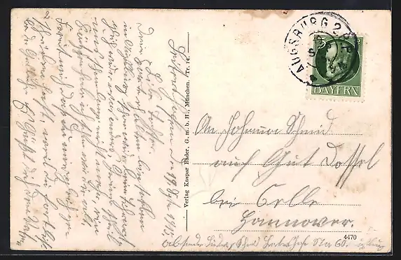 Personenbezogene Daten auf der Rückseite der Karte wurden durch blauen Textmarker unkenntlich gemacht. Die blauen Stellen sind auf die Vorderseite durchgeweicht und wirken sich negativ auf das Postkartenfoto aus