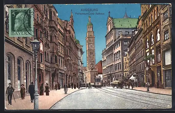 AK Augsburg, Strasse am Perlachturm und Rathaus, Strassenbahn