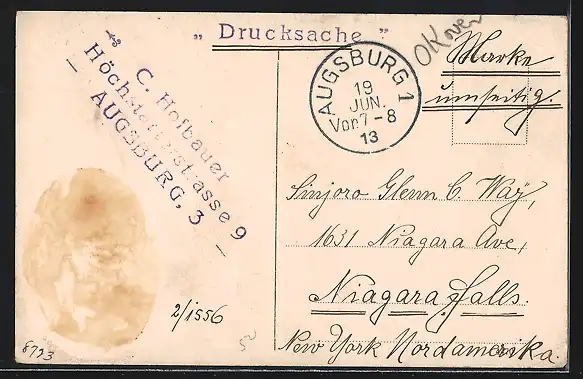 Personenbezogene Daten auf der Rückseite der Karte wurden durch blauen Textmarker unkenntlich gemacht. Die blauen Stellen sind auf die Vorderseite durchgeweicht und wirken sich negativ auf das Postkartenfoto aus