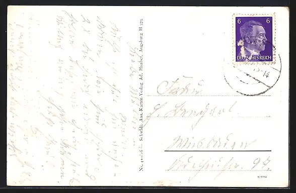 Personenbezogene Daten auf der Rückseite der Karte wurden durch blauen Textmarker unkenntlich gemacht. Die blauen Stellen sind auf die Vorderseite durchgeweicht und wirken sich negativ auf das Postkartenfoto aus