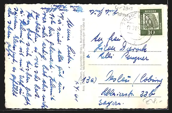 Personenbezogene Daten auf der Rückseite der Karte wurden durch blauen Textmarker unkenntlich gemacht. Die blauen Stellen sind auf die Vorderseite durchgeweicht und wirken sich negativ auf das Postkartenfoto aus