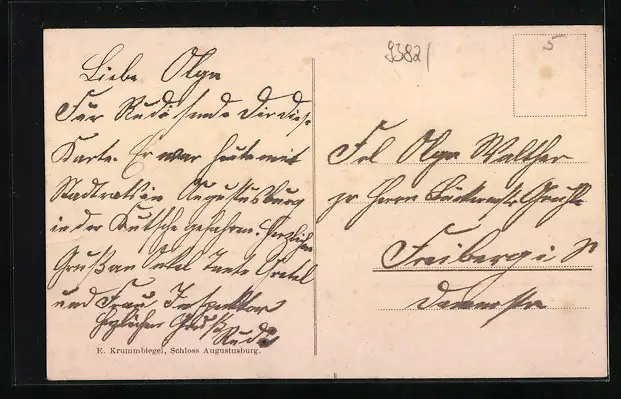 Personenbezogene Daten auf der Rückseite der Karte wurden durch blauen Textmarker unkenntlich gemacht. Die blauen Stellen sind auf die Vorderseite durchgeweicht und wirken sich negativ auf das Postkartenfoto aus