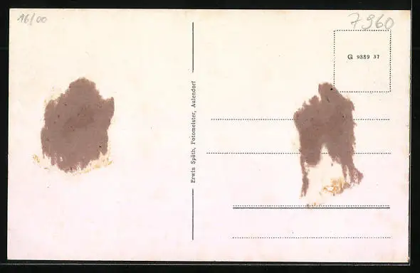 Personenbezogene Daten auf der Rückseite der Karte wurden durch blauen Textmarker unkenntlich gemacht. Die blauen Stellen sind auf die Vorderseite durchgeweicht und wirken sich negativ auf das Postkartenfoto aus