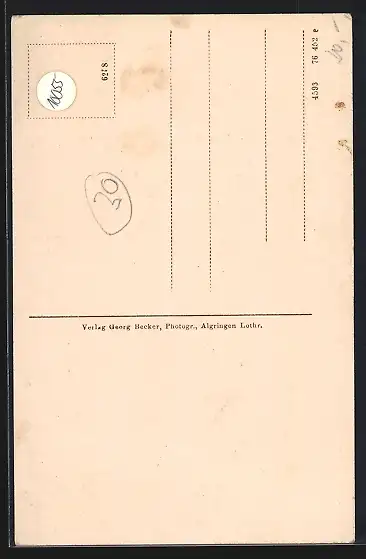 Personenbezogene Daten auf der Rückseite der Karte wurden durch blauen Textmarker unkenntlich gemacht. Die blauen Stellen sind auf die Vorderseite durchgeweicht und wirken sich negativ auf das Postkartenfoto aus