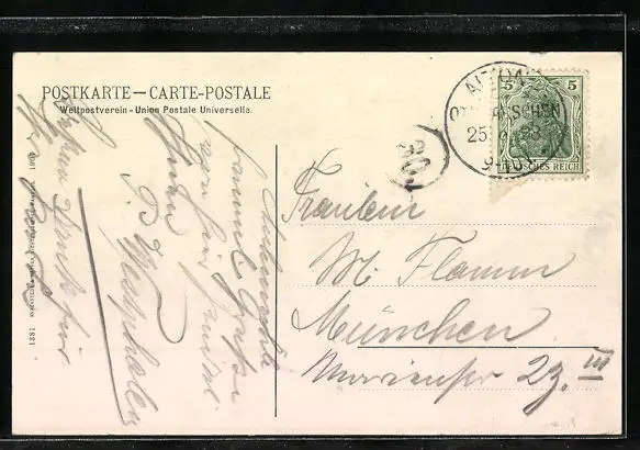 Personenbezogene Daten auf der Rückseite der Karte wurden durch blauen Textmarker unkenntlich gemacht. Die blauen Stellen sind auf die Vorderseite durchgeweicht und wirken sich negativ auf das Postkartenfoto aus