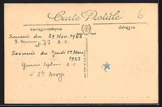 Personenbezogene Daten auf der Rückseite der Karte wurden durch blauen Textmarker unkenntlich gemacht. Die blauen Stellen sind auf die Vorderseite durchgeweicht und wirken sich negativ auf das Postkartenfoto aus