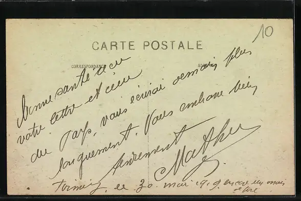 Personenbezogene Daten auf der Rückseite der Karte wurden durch blauen Textmarker unkenntlich gemacht. Die blauen Stellen sind auf die Vorderseite durchgeweicht und wirken sich negativ auf das Postkartenfoto aus