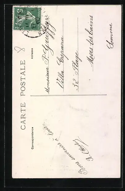 Personenbezogene Daten auf der Rückseite der Karte wurden durch blauen Textmarker unkenntlich gemacht. Die blauen Stellen sind auf die Vorderseite durchgeweicht und wirken sich negativ auf das Postkartenfoto aus