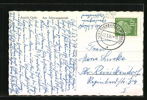Personenbezogene Daten auf der Rückseite der Karte wurden durch blauen Textmarker unkenntlich gemacht. Die blauen Stellen sind auf die Vorderseite durchgeweicht und wirken sich negativ auf das Postkartenfoto aus