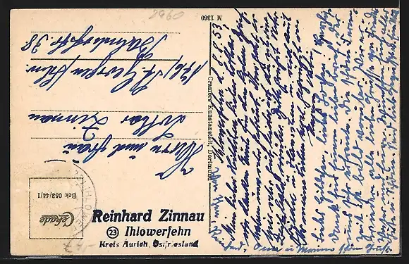 Personenbezogene Daten auf der Rückseite der Karte wurden durch blauen Textmarker unkenntlich gemacht. Die blauen Stellen sind auf die Vorderseite durchgeweicht und wirken sich negativ auf das Postkartenfoto aus