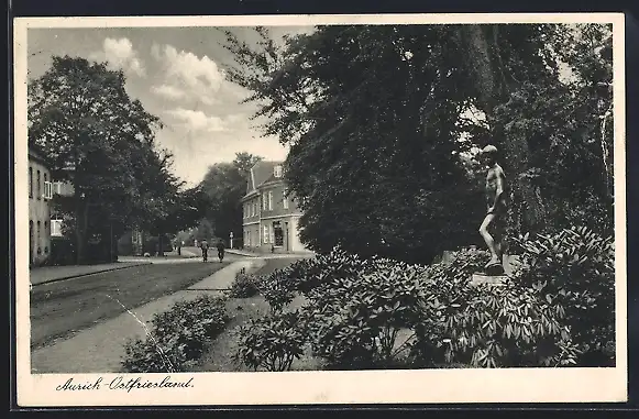 AK Aurich /Ostfriesland, Strassenpartie mit Statue