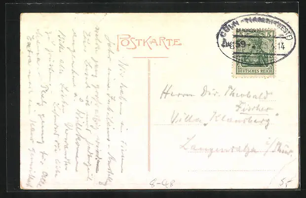 Personenbezogene Daten auf der Rückseite der Karte wurden durch blauen Textmarker unkenntlich gemacht. Die blauen Stellen sind auf die Vorderseite durchgeweicht und wirken sich negativ auf das Postkartenfoto aus