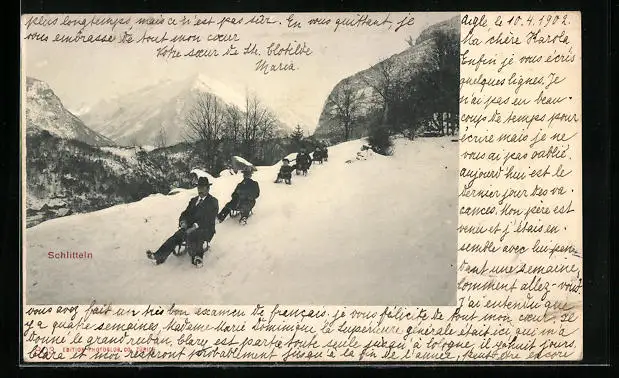 AK Ausflügler mit Schlitten in den Bergen, Schlitteln