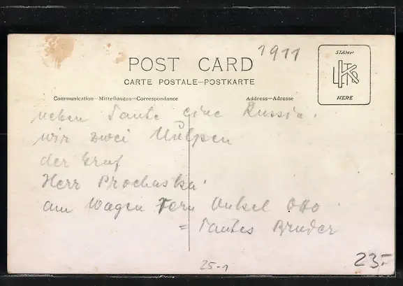Personenbezogene Daten auf der Rückseite der Karte wurden durch blauen Textmarker unkenntlich gemacht. Die blauen Stellen sind auf die Vorderseite durchgeweicht und wirken sich negativ auf das Postkartenfoto aus