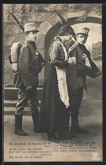 AK Ausrückende österreichische Soldaten in Uniform werden von einer Frau begleitet